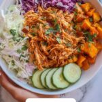 This BBQ Chicken Bowls recipe features tender shredded chicken cooked in a flavorful Whole30 BBQ sauce, paired with roasted sweet potatoes seasoned with chili powder and cinnamon. Complemented by a crisp, tangy coleslaw and homemade pickles, these bowls are a satisfying, well-balanced meal perfect for a nutritious lunch or dinner.