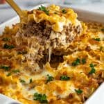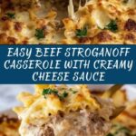 This Beef Stroganoff Casserole combines tender ground beef, creamy mushroom sauce, and perfectly cooked egg noodles baked to bubbling perfection with melted mozzarella and Parmesan cheese. An easy, comforting American classic casserole perfect for family dinners or make-ahead meals.