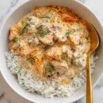 This creamy chicken and mushrooms recipe features tender boneless chicken thighs cooked with sautéed onions, garlic, and mushrooms in a rich dill-infused cream sauce. Perfectly balanced with white wine and chicken broth, this dish is a comforting meal ready in 30 minutes and ideal for serving over mashed potatoes, rice, pasta, or polenta.