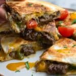 These Chili Lime Steak Fajita Quesadillas combine marinated flank steak with sautéed bell peppers and onions, all layered with melted cheese inside warm flour tortillas. Perfectly seasoned with a zesty chili lime marinade and cooked to crispy, golden perfection, these quesadillas make a quick and flavorful meal ready in just 30 minutes.