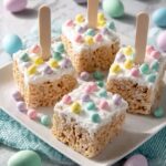 Dip each Rice Krispie square halfway into either the melted dark or white chocolate, allowing any excess to drip off naturally. Immediately insert a popsicle stick into each treat for easy handling and sprinkle with festive Easter sprinkles or your choice of toppings. This is the fun part where creativity shines!