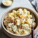 This dish is traditionally served cold or at room temperature. If you prefer it a bit warmer, simply let it sit at room temperature for 15 to 20 minutes before serving. Avoid microwaving as it can alter the creamy texture and soften the potatoes too much.