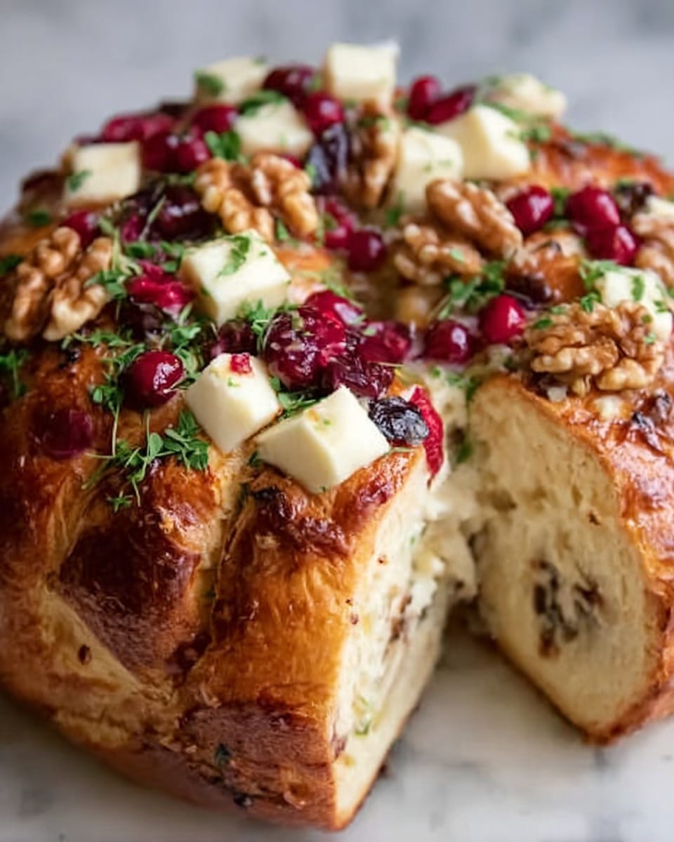 - Garnish and Serve: Remove the bread from the oven and, if desired, sprinkle fresh rosemary or thyme on top for a fragrant garnish. Serve warm so everyone can pull apart the bread easily and enjoy the melted Brie with cranberry in every bite.