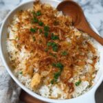 This Creamy French Onion Chicken casserole combines tender cubed chicken, savory French onion soup, and creamy Gruyere cheese for a comforting, hearty meal topped with crunchy French fried onions and perfectly baked rice.