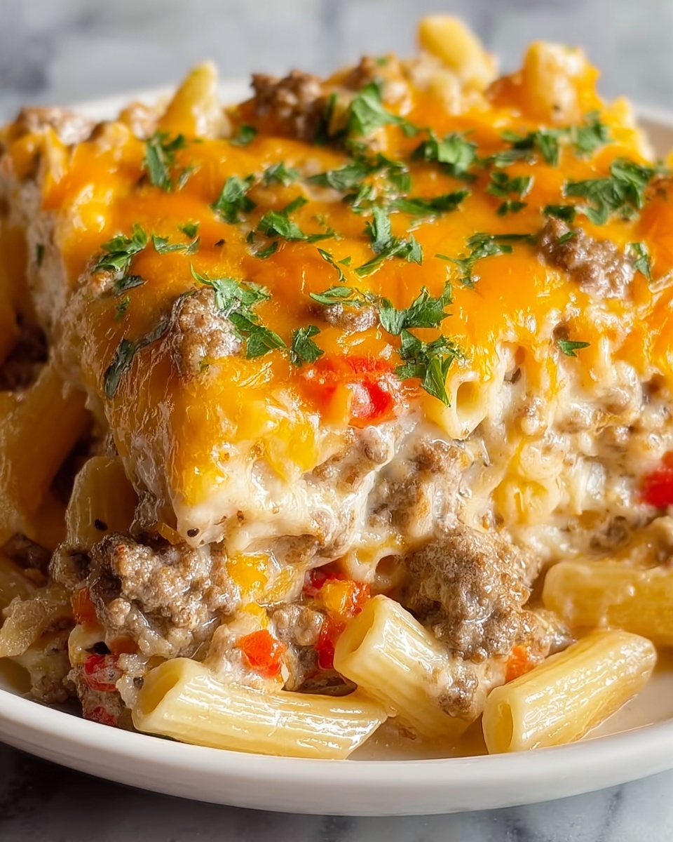 This Creamy Rotel Pasta with Ground Beef is a deliciously comforting one-pan meal that combines savory browned beef, spicy Rotel tomatoes, and tender pasta cooked in a luscious cream sauce. Perfect for a quick weeknight dinner, this recipe offers rich flavors with a hint of heat and a cheesy finish, garnished with fresh parsley.