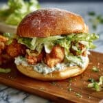 This Crispy Chicken Caesar Sandwich recipe offers a perfect blend of crunchy, tender chicken breast seasoned and fried to golden perfection, paired with a tangy Caesar dressing and fresh romaine lettuce on crusty sourdough bread. Perfect for a satisfying lunch, this sandwich combines classic Caesar salad flavors with the comfort of a fried chicken sandwich.