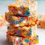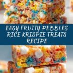 Delightfully colorful and chewy Fruity Pebbles Rice Krispie Treats made with melted butter, mini marshmallows, and Fruity Pebbles cereal. These no-bake treats are easy to prepare, perfect for a quick snack or fun dessert for all ages.