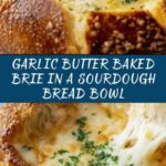 A warm and savory appetizer featuring a wheel of creamy brie cheese baked in a hollowed sourdough bread bowl with garlic butter, fresh herbs, and savory spices. Perfect for holiday gatherings and easy entertaining, this garlic butter baked brie offers a melty, flavorful dip served right in the edible bread bowl.