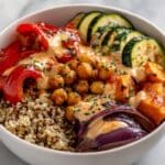- Assemble the Bowl: Spoon cooked quinoa or rice into serving bowls as a base. Add a generous portion of the roasted vegetables and chickpeas on top of the grains.