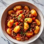 A hearty and comforting Gnocchi Bolognese recipe featuring tender gnocchi tossed in a rich, flavorful meat sauce made with lean ground beef, aromatic vegetables, fresh herbs, and a hint of red wine, finished with Parmesan and fresh basil for a delicious Italian-inspired meal.