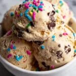 Serve your Greek Yogurt Cookie Dough Recipe in cute mini jars or ramekins for a fun, portion-controlled dessert. You can also spread it between two graham crackers for an easy cookie dough sandwich. It freezes beautifully shaped into small balls, perfect for a bite-sized snack whenever the craving hits.
