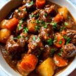 This stew pairs wonderfully with crusty bread or dinner rolls for soaking up every last drop of the rich sauce. You could also serve it alongside a simple green salad or buttered egg noodles to round out the meal with extra texture and flavor contrasts.