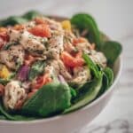 Since this is a cold salad, reheating isn’t necessary. If you prefer a warm protein option, you can gently warm the shredded chicken separately and then mix it in fresh just before serving to keep the veggie crunch intact.