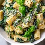 Reheat gently in a skillet over low heat, adding a splash of water or broth if the sauce has thickened too much. You can also microwave it covered, stirring halfway through, but reheating slowly helps preserve the creamy texture and keeps the spinach from becoming mushy.