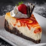 For a party, try serving individual cheesecake parfaits in clear glasses to showcase the pretty swirl pattern. Layer with fresh fruit and crushed graham crackers on top for a bite-size indulgence that’s both elegant and fun. You can also rim the springform pan with edible flowers or citrus slices for extra flair.