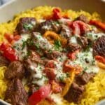 To reheat, warm gently in a skillet over low heat or microwave in short bursts, stirring occasionally so the steak stays tender and the rice heats evenly. A splash of broth or water can help revive the dish if it feels a bit dry.
