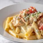 This One Pot Taco Chicken Alfredo Pasta combines bold taco seasoning with creamy Alfredo sauce in a quick and easy one-pot meal. Juicy chicken breasts are cooked with taco spices, then simmered with penne pasta in chicken broth. A rich Alfredo sauce made from butter, heavy cream, and Mexican blend cheese ties everything together, finished with fresh diced tomatoes and a sprinkle of sharp cotija cheese for a flavorful Tex-Mex twist on classic comfort food.
