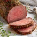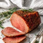 Slice the roast thinly against the grain, ensuring tenderness in every bite. Serve alongside the horseradish sauce, garnishing optionally with fresh parsley or chives for an inviting presentation.