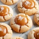 Once baked, let the cookies cool on the baking sheet for 5 minutes before transferring them to a wire rack. While still slightly warm, drizzle melted caramel over each cookie, then sprinkle flaky sea salt on top. Allow the caramel to set fully before digging in to enjoy that delightful salted caramel goodness.