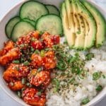 This vibrant Spicy Salmon Bowls recipe features perfectly cooked jasmine rice infused with coconut milk, tender broiled salmon seasoned with Asian spices, and fresh cucumber pickled in rice vinegar. Topped with creamy sriracha mayo, sliced avocado, furikake, and fresh chives, this bowl delivers a perfect balance of spicy, tangy, and savory flavors in a wholesome, satisfying meal.