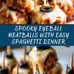 10. Top with Meatballs: Place 2-3 cheesy eyeball meatballs on top of each nest of spaghetti to complete the spooky theme.