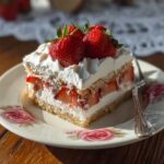 When it’s time to serve, garnish the cake with more sliced strawberries for that stunning, fresh look. Cut it into squares with a sharp knife and serve chilled. You’ll notice the layers hold beautifully, giving you that perfect bite every time.