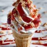 Freezing these cones is possible but not ideal since the fresh strawberries and crunchy topping might lose their texture upon thawing. If you choose to freeze them, wrap each cone individually in plastic wrap and place in a freezer-safe container. Thaw in the fridge for several hours before serving.