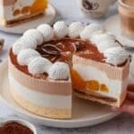 Right before serving, dust the top with a light layer of cocoa powder to add that final elegant flourish. Then slice into generous servings and enjoy each bite of this sumptuous wonder.