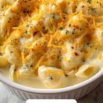 Tini’s Viral Mac and Cheese is a rich and creamy baked pasta dish featuring a blend of mozzarella, Colby Jack, and sharp cheddar cheeses. Cooked al dente and enveloped in a luscious cheese sauce made with evaporated milk, heavy cream, and spices, this comforting classic is baked to bubbly perfection and topped with a golden crust. Garnished with fresh chives or parsley, it’s a guaranteed crowd-pleaser perfect for family dinners or gatherings.
