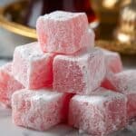 This traditional Turkish Delight recipe offers a delicate, chewy treat infused with fragrant rose water or orange blossom water, perfect for a homemade Middle Eastern dessert. With a smooth, chewy texture and a subtle floral aroma, these bite-sized cubes are dusted with a sweet powdered sugar and cornstarch coating to prevent sticking. A delightful gluten-free and vegan sweet to enjoy or gift.